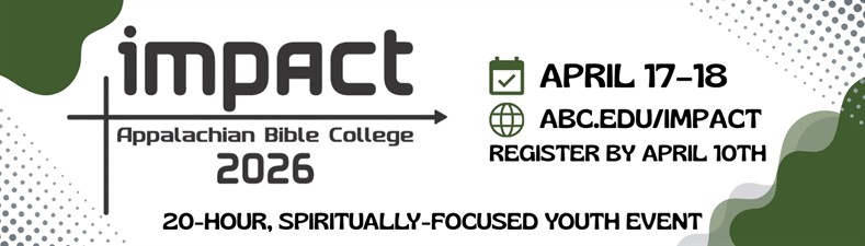 IMPACT is an annual event sponsored by the Youth and Family Ministry Department of Appalachian Bible College for the purpose of reaching and challenging junior high and senior high students as well as promoting Appalachian Bible College as a place of training for ministry.