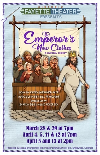 Laugh your socks off in this fairy-tale pop musical with eclectic styles ranging from Celtic to 20s jazz to 50s rock and more! The kingdom of Glump has been falling apart ever since the pampered emperor became wrapped up in his tasteless wardrobe! Not only is he a big-headed clothes-aholic, his three ’lovely’ daughters are quickly becoming chips off the old blockhead. Enter two con artists, Wart and Hog, who devise their ingenious plan for fleecing the emperor. Naturally, everyone pretends to ’see’ the magic cloth, until the emperor’s serving boy covers him up at the parade, laying bare the facts: the emperor has no clothes on! The serving boy’s honesty is contagious, and the emperor has quite a revelation. He’s been blind to his own selfishness — and nakedness! — until this fateful day. But make way for one more hilarious scene in which his daughters, who haven’t heard the news, appear in their underwear, too! (Tastefully done, we promise!) !The naked truth has never been funnier!